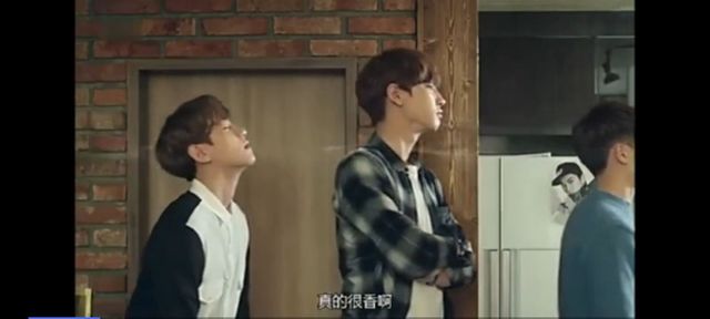 朴灿烈被旁边的边伯贤(最佳助攻王)推了出去,可是由于吃米糕吃的太快了,所以被噎到了