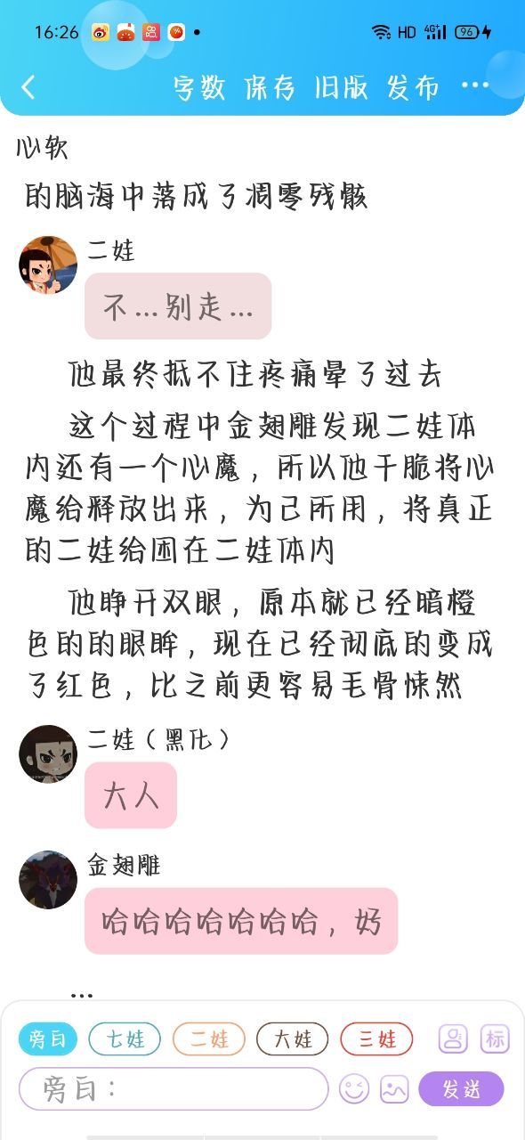 苏洛挽(作者):在这说一下,那个二娃呢自己没被黑化,只是金翅雕把二娃的心魔给释放出来了(看过第三章的应该知道,那个跟二娃对话的就是心魔)二娃的气息也让金翅雕给变弱了(连同记忆也被打碎,只不过会偶尔想起一些零碎的记忆),而他的心魔又被金翅雕下了不明药水,所以他才会叫金翅雕“大人”