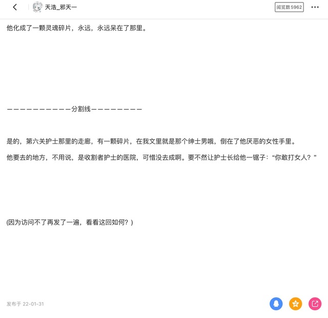 是的,第六关护士那里的走廊,有一颗碎片,在我文里就是那个绅士男哦,倒在了他厌恶的女性手里。