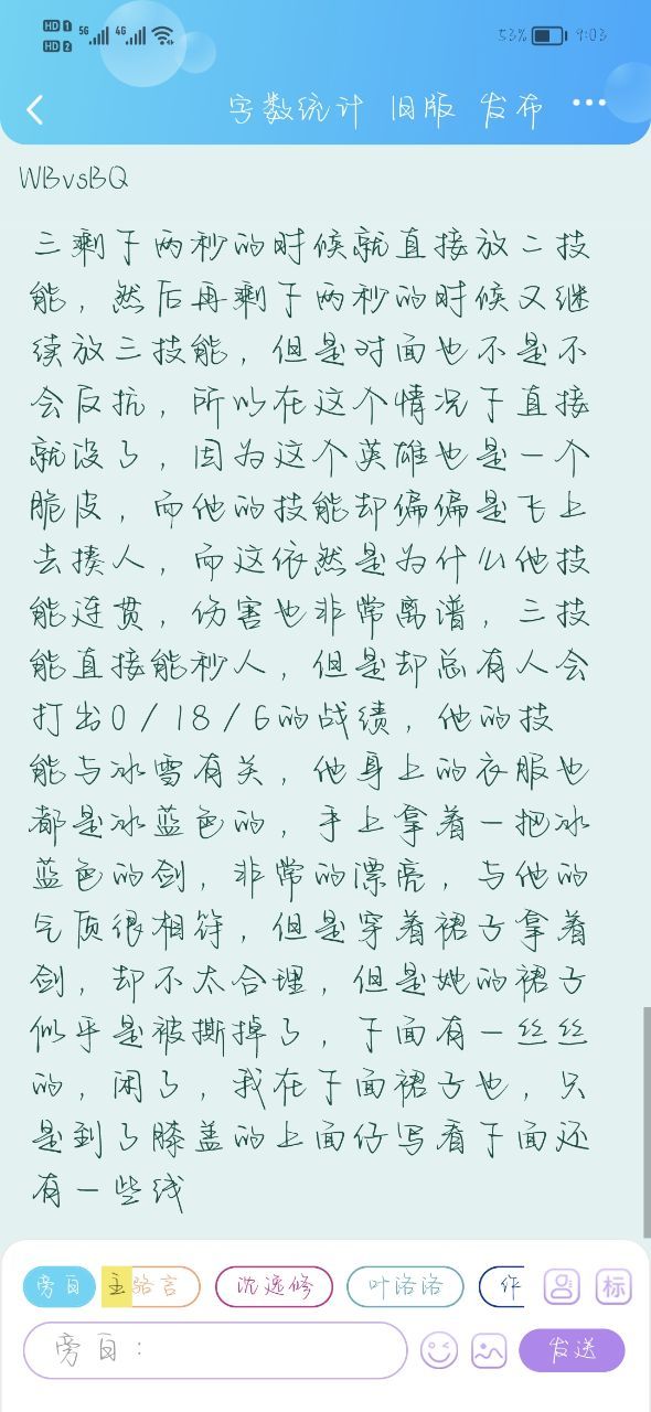 全身看上去有些破旧了,但是上面冰蓝色的雪花却没有一丝的损坏,裙子的边边角角扯都出了很多丝线,她披散着头发,背景中似乎有很多寒风向他吹来,他却没有任何的感觉的发,随着风的方向向后飘散,眼泪是一双毫无感情,但却美得像冰清一般的深蓝色眼睛,只看一眼似乎就能把你吸入他的眼中,有着精致的五官,下巴略微有些尖耳朵上没有耳洞,但是脖颈处有一些被喷溅一般的血迹,连带着漂亮的蓝色裙子,上面也读出了一些血迹,但却只是为她添加了一丝谣言,没有改变任何的细致,衣服上画着瓶蓝色的雪花,明明是个非常可爱还是因为那些被丑丑的事件和洛洛的事情,他变得有些恐怖,绳子的袖子似乎有些明星烂的痕迹,有些层次不齐到大臂,小臂上和手指上都是学习手指非常的精致好看,雪白色的头发在空中飞舞,似乎要与雪花融为一体,后面似乎有披纱似的东西,看着非常的,漂亮飞舞在身后,像是一片又一片的雪花飘落在身后,听从他的指挥,脚下穿着一双冰蓝色的鞋,不是平底鞋,但也不是高跟鞋,只是带着一点跟,看着明明是非常乖的形象,但是却因为手上的那把剑令他显得多出了一丝令人畏惧的气息,手上是一把冰蓝色的剑师,一般的剑忍,有着一丝薄薄的亮光本来应该是和他周身的气质不太相配,但是却因为那看见的鲜血是乱的,衣服下摆和知道他哪笔参差不齐的衣袖,让整体变得和谐又融洽,那是蓝色的眼睛,此刻让它变得如此危险,头上闪烁的黄光万物,告诉着其他人,他是某族的公主,但是因为一些事情变成了这副样子,其实通过他现在脑子就会感觉这个人其实挺可怜的,北京的雪花一天一天打在他的身上,身后的背景也逐渐浮现,是一座盖在雪地里的城堡在,一九二十冰蓝的颜色看不到里面,而他正站在最前方,身后是已经缩小成了跟他人差不多大的城堡,这是他出场的样子,而他所说的话又一下一下的敲击在别人的心弦,只见他那时候对于冰雪没有任何影响的红唇,轻轻吐出几个字,而最新鲜的是,在那指着你的时候,不管怎样,他都是一直指着你的,不管是哪个角度?他的眼中松松燃起的战意,让所有人都被烫了一下,然后就这样,战局逐渐开始,我控制着受伤的英雄,先买了几件装备,然后来到了宠物,看了一眼对面的局势,对面辅助跟的竟然是上单哪座,说明下路应该是比较占优势的,我看着对面的中单,没有一丝,你想要放松的意思,其实我们已经赢了一局,但如果第二局不赢的话,那还会成为平局的状态,我很紧张,但我不能表现出来,看着冰心的出现,我并没有看到对面中单在哪里,只是对面和我身边都有一个草丛,只不过是,邪教飞车的草丛现在有两个选项,一个选项就是他可能还没到另一个选项就是他蹲在那个草丛里等他清兵我更偏向于他现在应该在那个他那面的草丛里