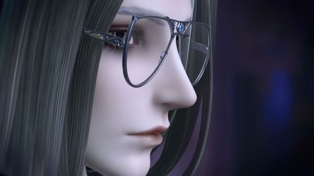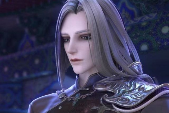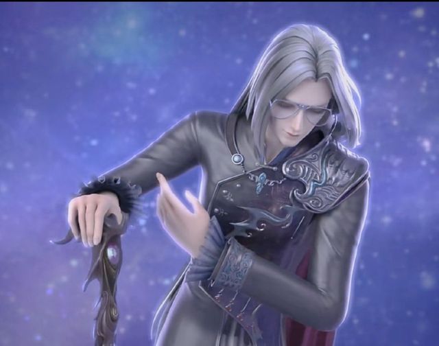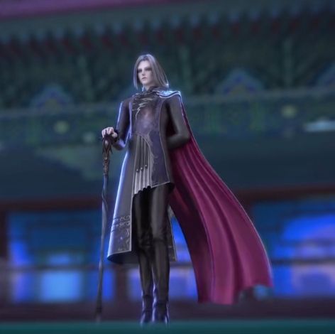 银灰色公主切长发,身着银色领服,颈部有缀着花纹的银色皮甲,内有一件淡紫色长衣,背后有棕红色的披风,黑色长裤,穿着一双黑色皮鞋。其整体服饰容貌类似于英俊的西方吸血鬼伯爵。