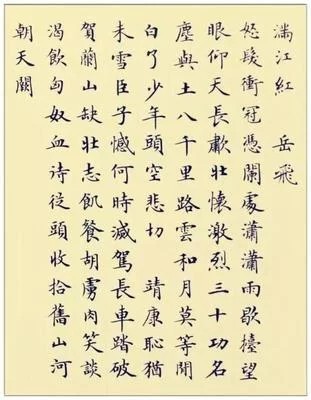 怒发冲冠,凭栏处、潇潇雨歇。抬望眼、仰天长啸,壮怀激烈。三十功名尘与土,八千里路云和月。莫等闲、白了少年头,空悲切。