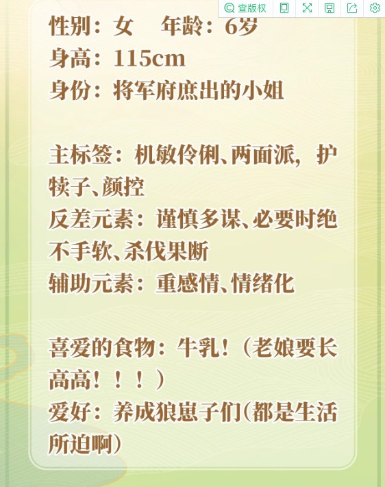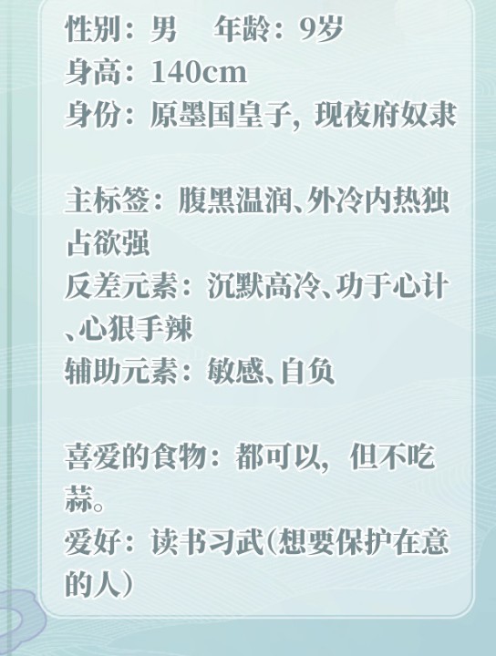 夜吟(小时候):性别:女 年龄:7岁 身高:125cm,身份:夜沐的小奴仆,真实身份敬请期待,性格:前期莽撞,后期变得沉稳。富有正义感,泼辣可爱,勇敢无畏,重情重义。