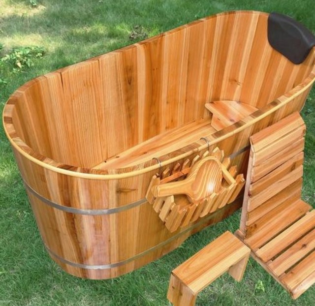 农村一般洗澡都在院子里,拿个大木桶,放些冷水,再从灶上用小木桶提了热水,倒进大木桶,人躺在大木桶里泡澡,象洗露天温泉浴。