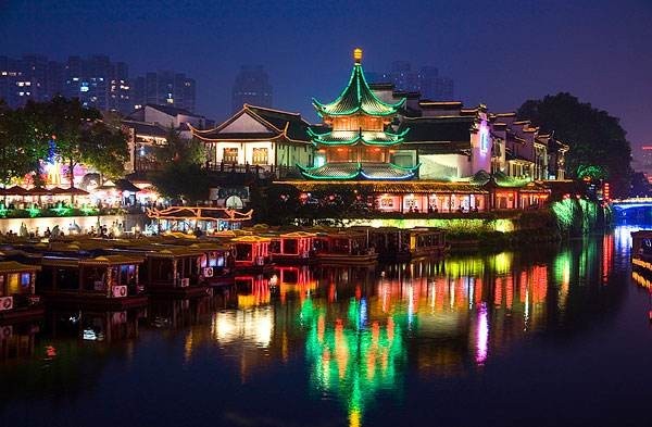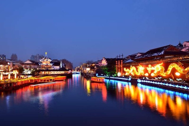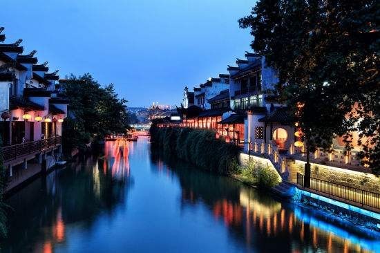 岸边的翠柳,新吐了鹅黄色的新芽,毛绒绒的,而那妖娆的绿枝,又如青春少女的胳膊。月儿妆罢,轻盈地从天边那片薄薄的云彩中露出羞怯的脸,盈盈的爬上了柳梢头。垂柳那柔细的枝条,沐浴着清淡的月光,犹如月儿披着的散发。渺渺清辉罩着相互缠绕的柳枝,又恰似少女低头散开那瀑布似的秀发,对着明镜似的河水,在细细的梳妆打扮。红蓝LED灯光倒映在静静的河面上,微风拂过河面,漾起的彩色波澜,从河中间向四周蔓延开去。