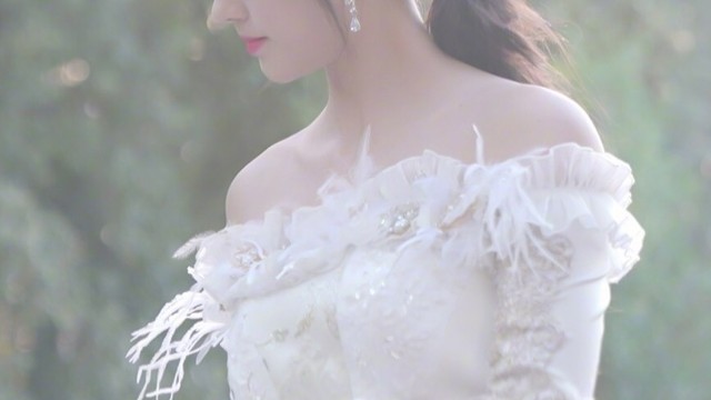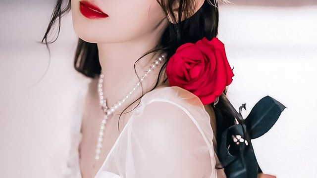 金色长发被高高的盘起,轻纱披在肩头,像是从仙境中跑出来的花仙子。一朵红色玫瑰花衬着一身白色,平添了几分妩媚。