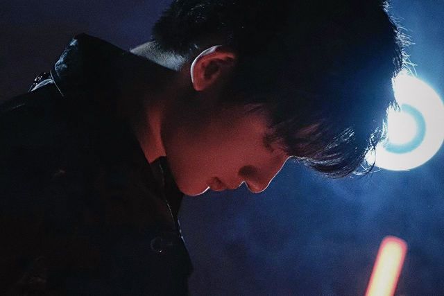 西装外套被脱下,薄纱般的黑色衬衫解开了两个扣子,轮廓清晰的锁骨,以及那宽肩细腰在时不时扫过的灯光下若隐若现。