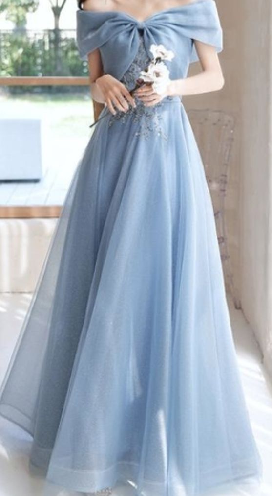 夏晨曦穿着淺蓝色一字肩的礼服