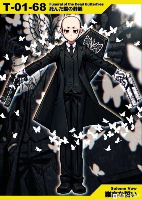 亡蝶葬儀(T-01-68)是一個人形異想體,一隻碩大的白色蝴蝶組成了它的頭部。它長有五條形似人類的手臂,其中一條手臂是從脖子上伸出來的。亡蝶葬儀身穿純黑的套裝,但脖子上的手臂套著純白的袖管。它背後的兩隻黑手持著一個巨大的黑色棺材,棺材上有一張類似它頭部的圖像。根據觀察日誌記錄,棺材裡有大量的白色蝴蝶。