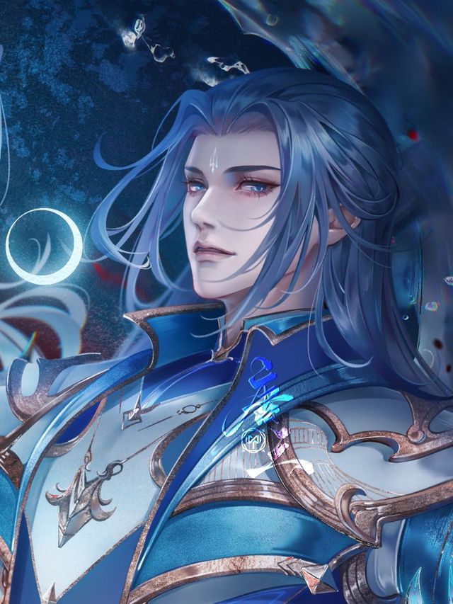深蓝色的头发,披散在腰间,斜飞的英挺剑眉,细长蕴藏着锐利的眼眸,奇怪的是,他的眼眸竟然是蓝色的,削薄轻抿的唇,棱角分明的轮廓,修长高大却不粗犷的身材,冷傲孤清却又盛气逼人,孑然独立间散发的是傲视天地的强势