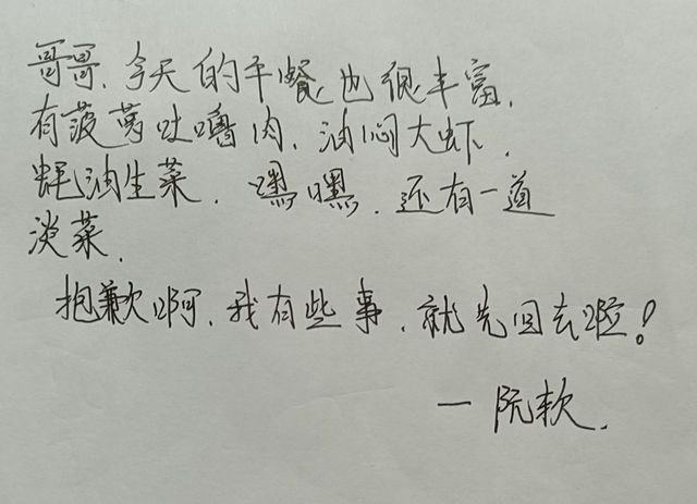 写好后,阮软将笔盖盖上放回笔筒,将纸压在盒饭的下面,就出去了,顺便也把门拉着关上。