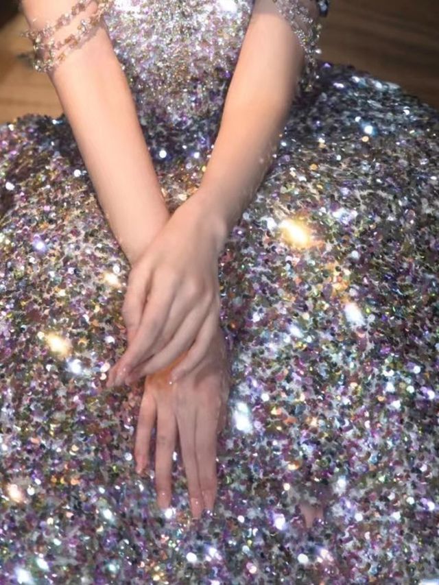 那布满钻石的银色礼服,花纹秀美,亮色非常,是一条昂贵的钻石裙,即使不在灯光下也闪闪发光。