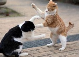 果不其然,这群流浪猫又站成两队弓着腰扎着毛,呜嗷呜嗷地叫着相互示威。