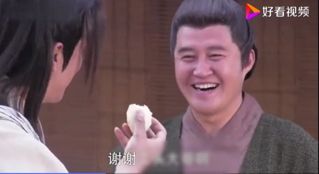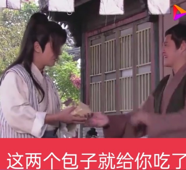 龙套男:"小兄弟,现在的气候多变,一会冷一会热的,我见你在这酷热难耐的大太阳下讨钱,也没见人给你一个铜板,我看你这样子实在也是不容易啊。我呀,也是穷人,没有余钱,正好我外出帮人家干活时,我家娘子多给我了几个包子,反正我也吃不完,还剩两个就留给你了。”
