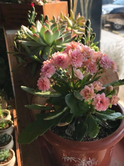 管家看着花店人员搬来的一盆盆的盆栽,抱起一盆长势喜人的香槟玫瑰,询问她。