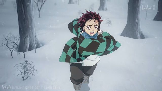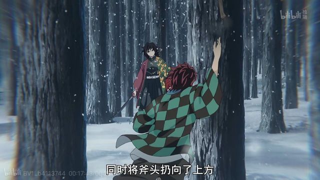 炭治郎捡起石头,砸向男子,男子用刀挡下,炭治郎在飘落的飞雪中捡起斧头,冲向发怒的男子,手中另一个石头被他扔了出去,男子的头往左偏了偏,躲过石头的攻击。