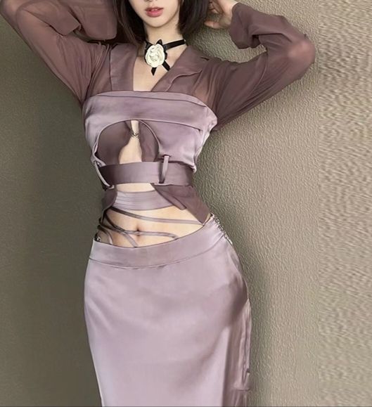 穿了紫色的连衣裙,腰部带了镂空,找了双高跟鞋,化了个截断