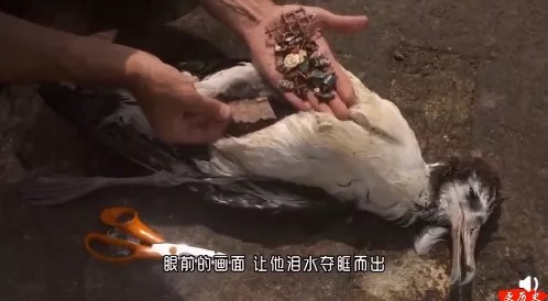 齐文轩:一只海鸟因消化问题,痛苦死去了。你无法想象它的肚子里,究竟吃进去了多少垃圾?塑料袋,螺丝,瓶盖,打火机……我们生活制造的每一样垃圾,都成了那最后一根稻草。