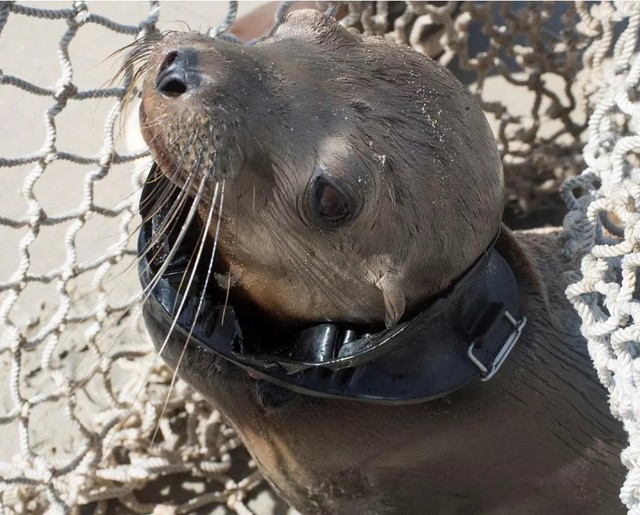 齐文轩:一只原本自由生活的海豹,被困住了。你无法得知,束缚住它们的东西可以有什么?轮胎,渔网,绳子,塑料圈……最后,只能全部化为它们眼里的惊恐和悲恸。