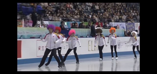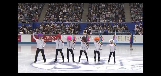 中国队的队员们戴上头套向大家走来,他们滑到了冰场的中央还跳了一段舞