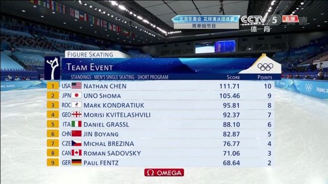 在2月4日上午的国家首都体育馆里,一场激烈的花样滑冰团体赛正在上演,而此刻正是男子单人滑短节目的比拼时刻。