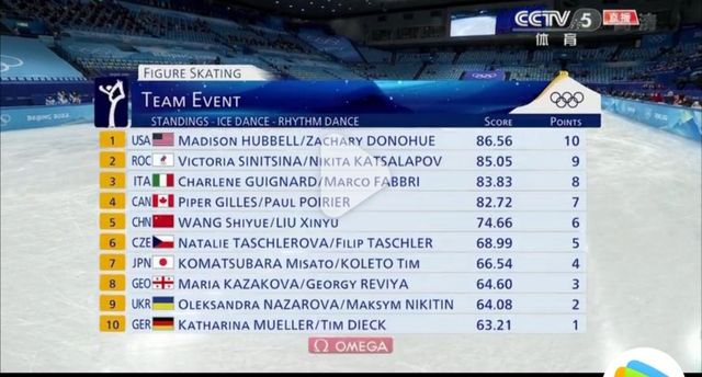 柳鑫宇/王诗玥冰舞韵律舞得分74.66,排名第五,为中国队拿下了6分的积分