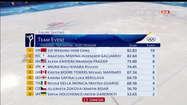 隋文静/韩聪双人滑短节目《碟中谍2》82.83分刷新了世界纪录,排名第一,为中国队拿下了10分的积分