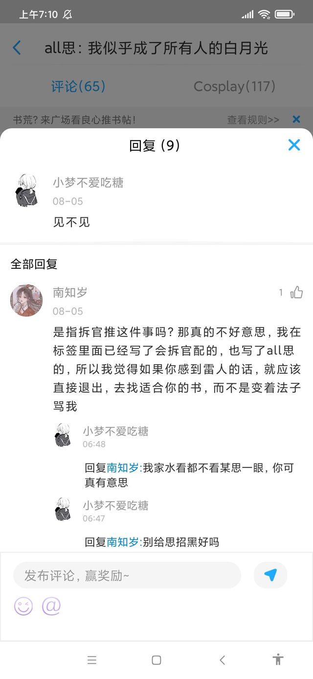 树上的鱼:叶罗丽他就是一个为了卖娃娃而搞出来的一个动画片,他要赚钱,他但凡专一一点只搞官配,我都不至于拆cp,而且这是同人文,我又不是去他们这些所谓的官配底下ky,拉郎配在同人文圈子里面很常见的
