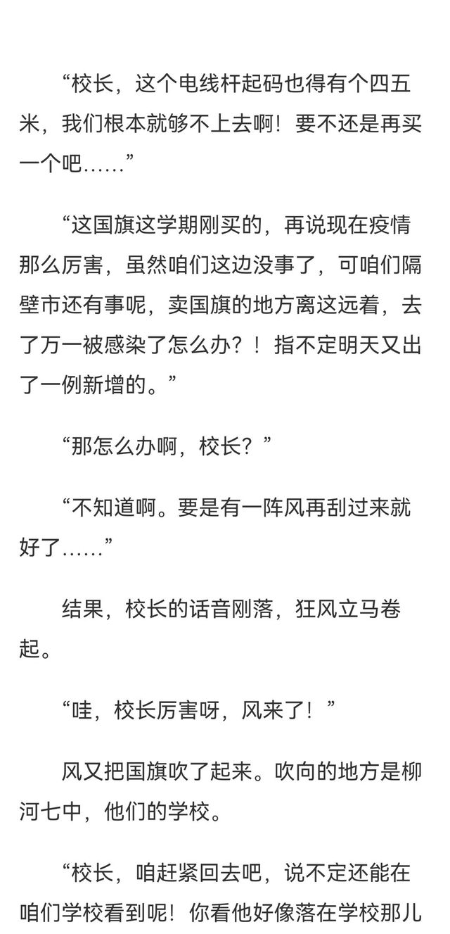 “我看到那国旗了,我听说是从市里的柳河七中刮来的。今天下午他们升旗的时候他们的国旗飞走了,想必就是这个吧。”