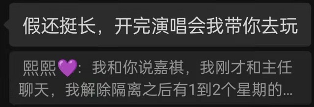 沈希澈:我和你说嘉祺,我刚才和主任聊天,我解除隔离之后有1到2个星期的假呢!!