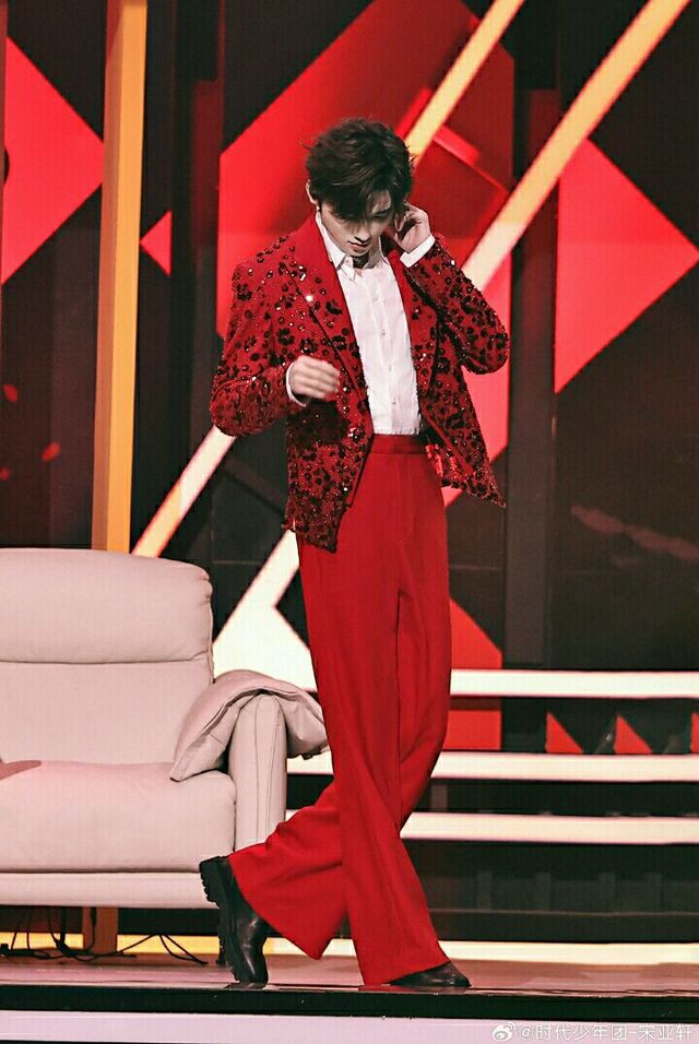红色的西装与宋亚轩甚是相配,站在舞台上的他闪闪发光,仿佛天生就属于舞台。