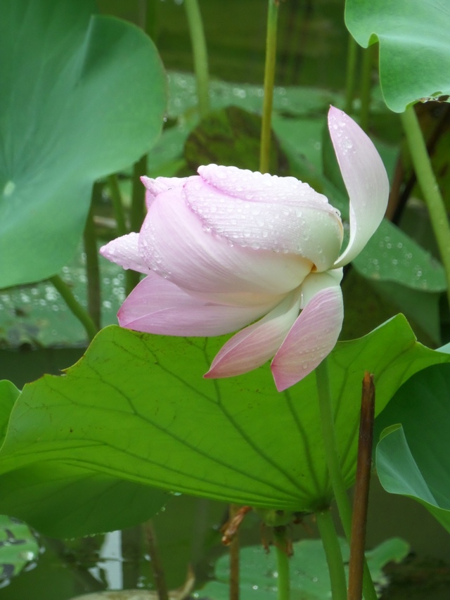 荷塘边的蒲苇,立在微雨中,静静守候。