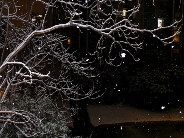 雪花落在敲窗的楸树枝上,白得显眼,夜幕中隐隐点缀着邻家灯火,不觉暖意融融。