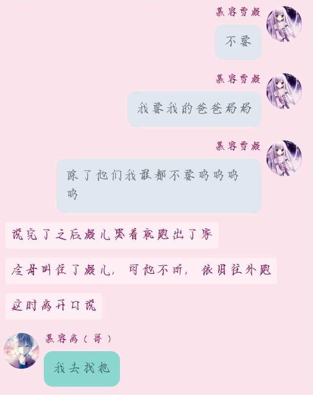慕容雪凝:然后…哥哥说要瞒着我,我听到后我不相信爸爸妈妈出车祸死了…然后他们发现了我,我问他们是不是真的,她们都不说话冷伯母对我说