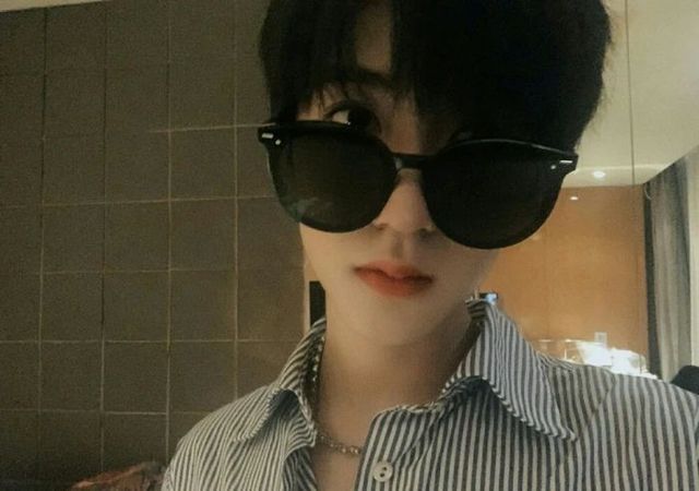 一身黑白条纹衬衫,脖子上挂着一条银色链子,黑色墨镜将他衬托的更加神秘和野性。