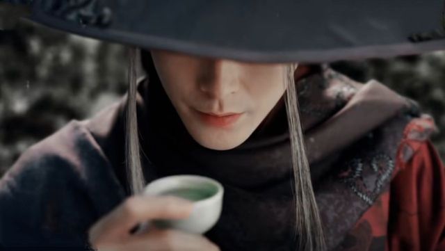 一帮拔着剑的劫匪围堵着一辆马车,马车顶棚上坐着一个人,一身黑衣,头戴斗篷,绑着护腕的手掌间拿着一樽青绿色的酒杯。