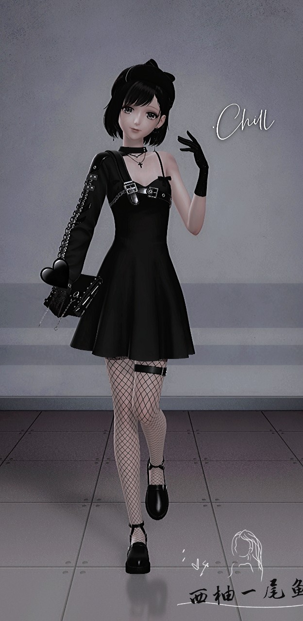 上半身的黑色裙子,带着一丝紧身的效果,很好的勾勒出了女孩完美的身材,胸前的弧度,细细的蛇腰,还有那紧身的渔网袜,勒着女孩腿上的肉……