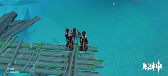 两个帝君看着一个帝君在水里游。