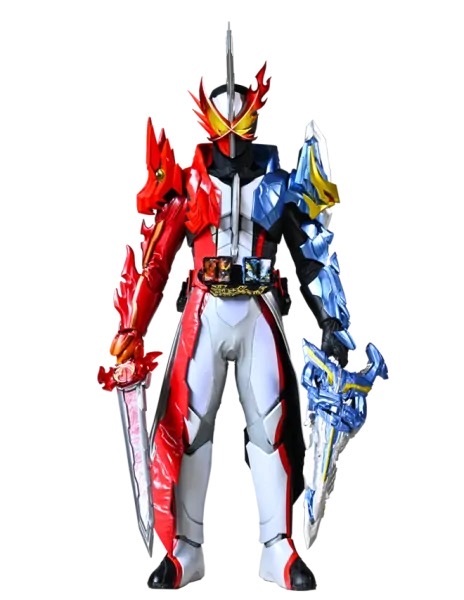 圣刃的背后出现两本巨大的奇幻驱动书,一本是勇气之龙,另一本是亚瑟王,两本书的书页均处于开启状态,两本书中分别飞出勇气之龙和亚瑟王的巨剑,两者结合后一起覆盖到圣刃身上,只听一声,烈火拔刀!第二册书交叠之时,强大的力量将寄宿于此圣剑!Wonder Rider!Dragon!Arthur-Ou!二重属性将研磨剑刃!