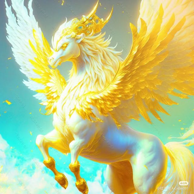为首通体金白双色,金色的双翼,头上还有金色的角的天马兽。