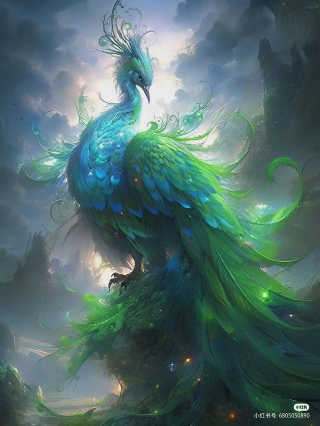 左边是通体青绿色羽毛的青鸾鸟。