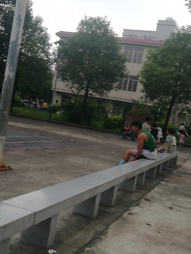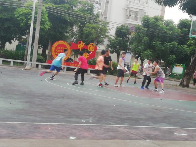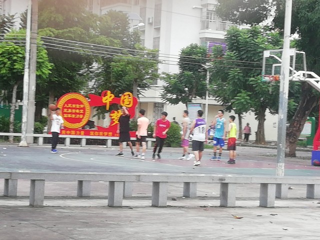 左边的有人在打球。不过看起来是陌生人,自来熟一起打。也有几位看起来初中高中生的样子,脸挺嫩,挺俊俏的。