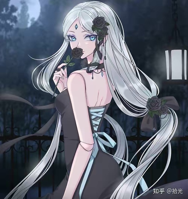 她穿着一件黑礼服,礼服把她身材凸显得非常完美,头发由两朵黑玫瑰分成两份。她就像一朵娇艳的黑玫瑰,让人蠢蠢欲动