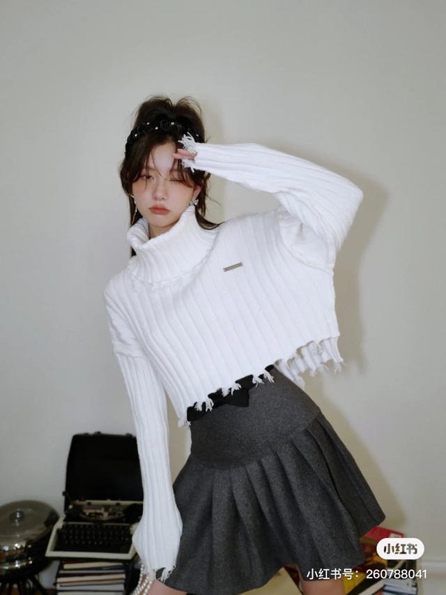 高领毛衣,短款适合搭配高腰裤或者半裙不锁边的破坏感随性自然