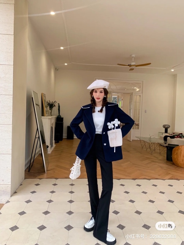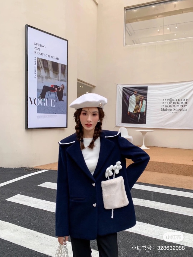 兼顾少女跟成熟女性感觉的一件秋冬西装外套,沉稳一单的藏青色配上纯白的小花装饰隐秘又活力,后背翻领中间做了个爱心形状