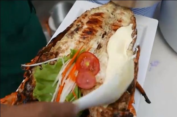 睡着香味四处张望了一下,对面有个烧烤店,他们正在外面碳烤大龙虾!