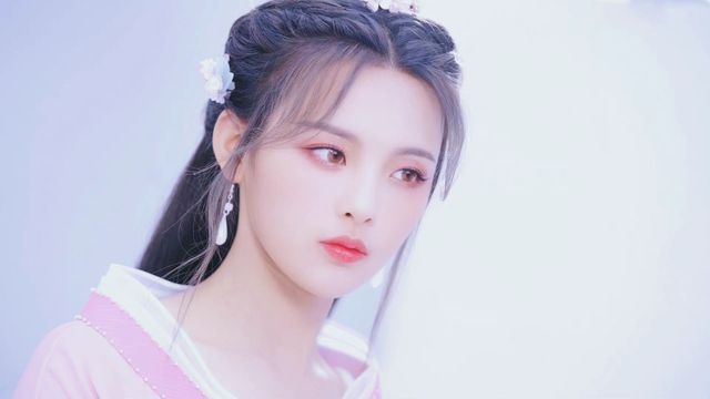 卿卿一袭粉白衣裙,温婉的粉色桃花妆将她漂亮的脸蛋衬的更加无害。
