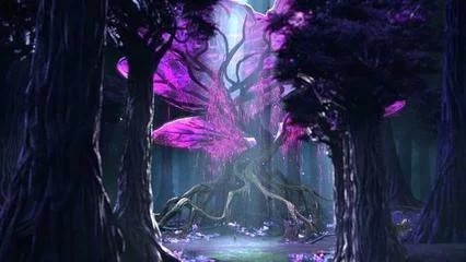 那是一株树叶发着紫色光芒的巨树,根部轻点在地面,浮在空中,一只大龙盘踞在上面。