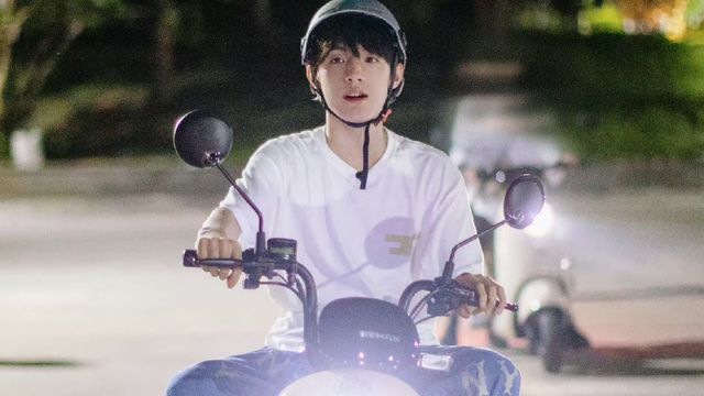 姐弟俩默契地朝前方看 果然有个人 骑着小电瓶 看上去是扫码的 关注点不是这个 骑在电瓶车上的男生 长相很有小狗的感觉 开郎阳光