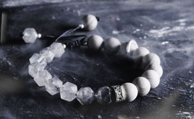那条手链是由一颗颗陨石状的玛瑙以及水晶串成的,在光亮的玻璃台上倔强的闪烁着一丝幽光。